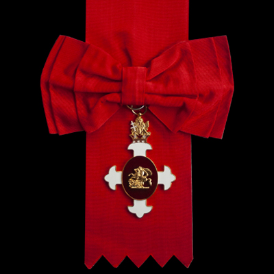 The Order’s investiture of Knighthood is recognized by its distinctive Insignia of a cross fleury bearing an oval panel depicting Saint George slaying a dragon, the whole suspended from a crown adorned with the Grant of Arms of the Order. In formal attire, it is worn around the neck on a blood red ribbon, with the ribbon underneath the collar or the band of a bow tie, and the Insignia sitting just below the knot of the tie or the bow tie. Dames of the Order may choose to wear the Insignia attached to the blood red ribbon fashioned into a bow and worn on the left shoulder.