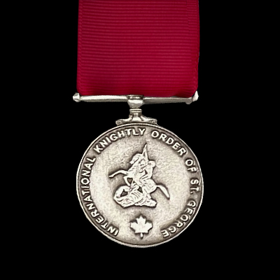 The Field Medal is comprised of a silver medallion with the inscription “International Knightly Order of St. George” around its circumference, with the Canadian maple leaf centered at the bottom. Central is a relief of St. George defeating the dragon. This medallion is suspended from a red ribbon approximately 1″ in width.